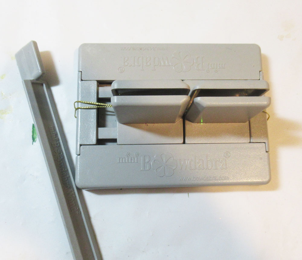 Cut 2 pieces of ribbon approximately 8″ in length, then place in the Bowdabra.