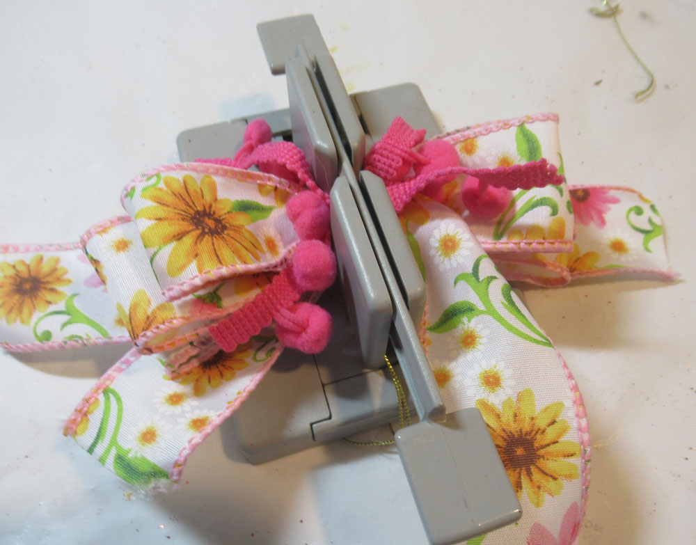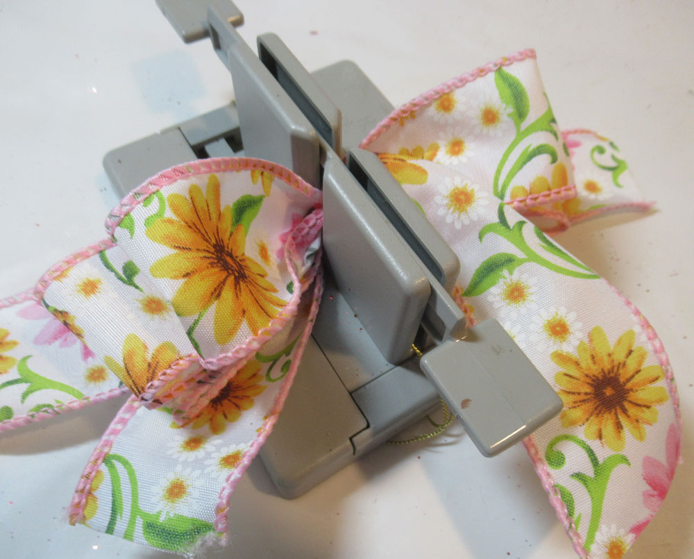 Create the bow by placing the ribbon in the channel, twisting the ribbon on each turn.