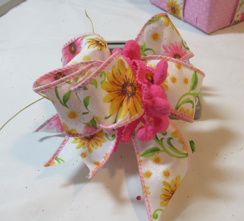 Use the excess bow wire to tie the bow to the ribbon strips.