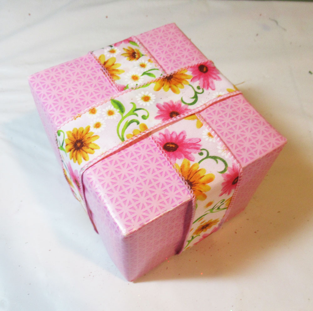 Wrap the package, then wrap with 2 pieces of the same ribbon.