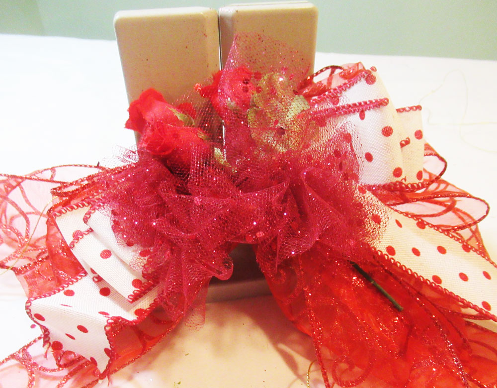 Add the second ribbon, leaving a 6″ tail.