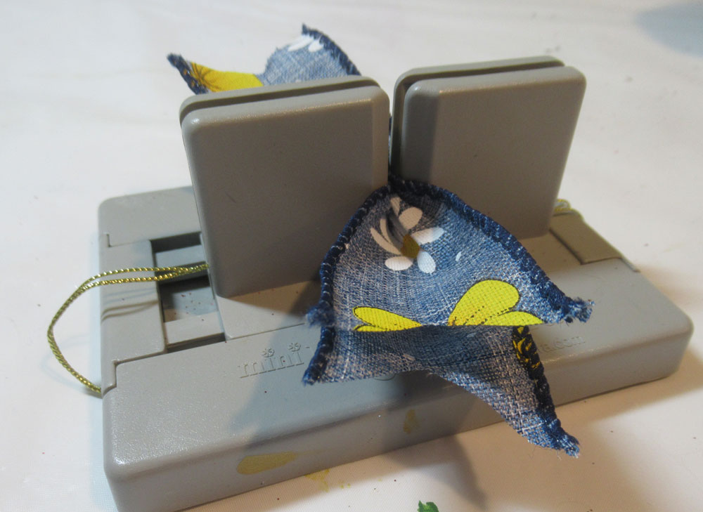 Cut 2 pieces of ribbon approximately 6″ in length, then place in the Bowdabra.