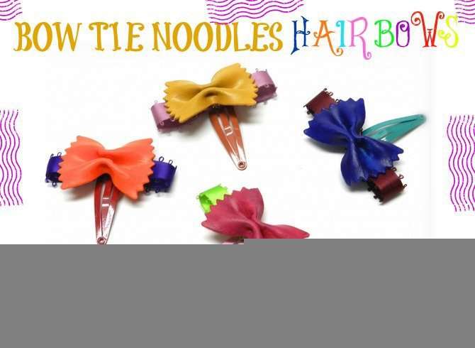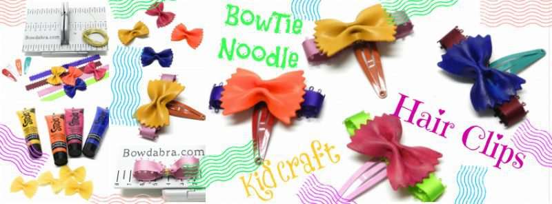 Here is a super fun and creative kids craft! Using bow tie noodles have children paint them all sorts of bright fun colors. Attach the painted bow tie noodles to Bowdabra Bows and glue them onto snap clips.