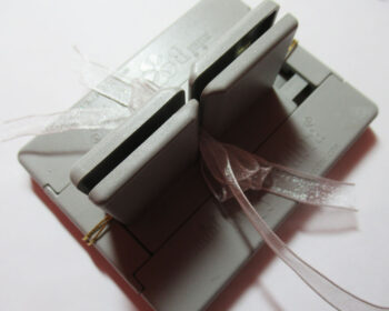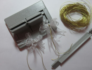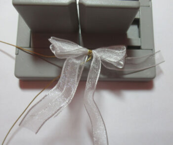 Tuck the two loose wires through the loop and pull tight while the bow is still in the Bowdabra. Remove, separate the wires, turn to the back and tie a knot and double knot.