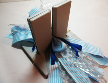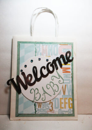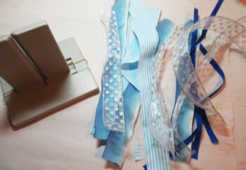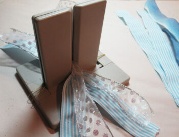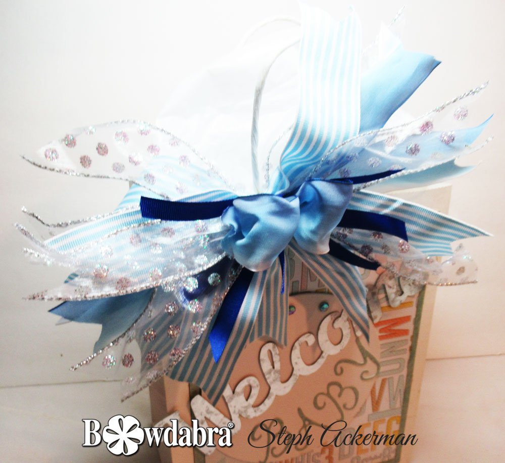 Hi everyone, Steph Ackerman here and I am sharing how to create the perfect gift bag bow using the Bowdabra. You can make this bow in any color or style to personalize it. The example is for a Baby shower or baby gift but it can easily be changed for almost any gift by switching around the ribbon colors. It is such a great way to use up leftover ribbon. If you use masculine colors, this will be a great addition to your Father’s Day gift this year.