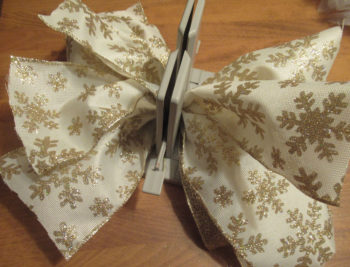 Cut 3 lengths of gold snowflake ribbon approximately 12″ and place in the Bowdabra.