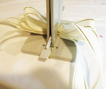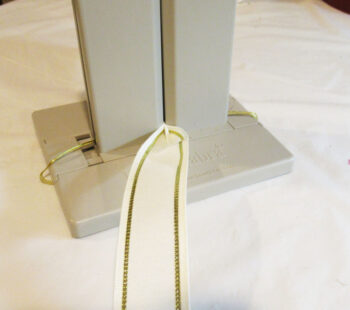 Tuck the ends underneath while making the bow. Next, cut a 12″ length of ribbon and place it in the Bowdabra.