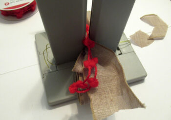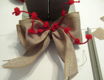 Next, cut a 12″ length of burlap ribbon and place in the channel.