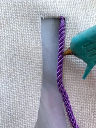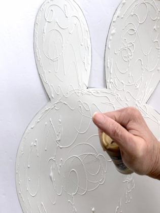Next, begin gluing on the twisted rope using hot glue along the edge between the bunny ears, moving around the ears and . . .