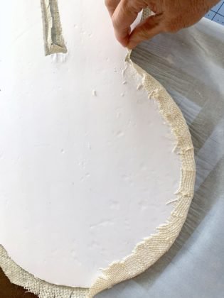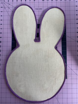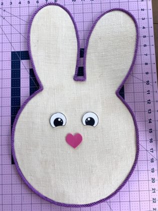 overlap edges and glue to backing. Let dry. The back can be covered with additional burlap following the outline of the bunny head.