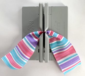 Next, leave the ribbon on the roll to make your first loop. Fold over and make a crease into the ribbon creating a five-inch loop and press into the Bowdabra.
