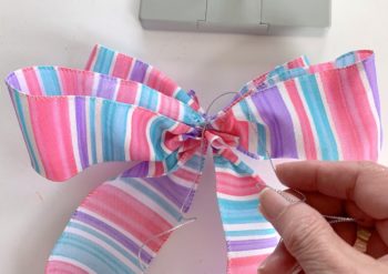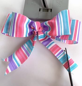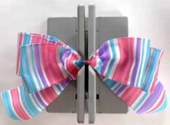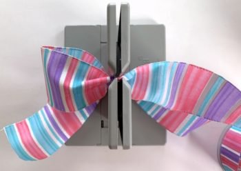 Fold a 24″ piece of Bowdabra wire in half and lay it in the Bowdabra, tucking ends under. Measure 8″ of 2.5″ ribbon for the tail and make a crease in the middle, placing the ribbon at the crease mark and place it down into the center of the Bowdabra.