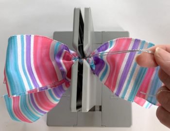 Pull the Bowdabra bow wire tightly while the bow is still in the Bowdabra and gently pull the bow out of the Bowdabra. Separate the loose wire ends and take them around to the back of the bow and tie in several knots to secure. Cut off excess wire. Straighten and fluff bow.