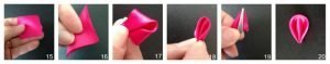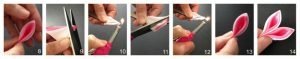 These ribbon folding pieces for the bunny’s ears and tonque are similar to Japanese fabric folding techniques called Kanzashi that are very popular using ribbon.
