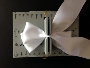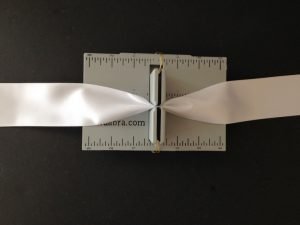 1. Cut and seal two 3 inch lengths of white 1.5″ wide ribbon using the Proxxon hot wire cutter. Or you can seal the ends with a lighter flame.