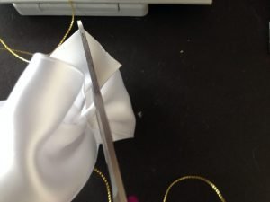 11. Turn ribbon around placing tweezers near longer edge, cutting about 1/4″ off.