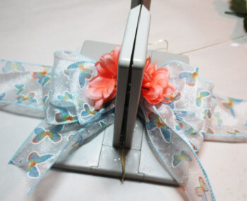 Place 2 flowers in the Bowdabra. Bowdabra bow maker allows you to add the floral touches directly in the Bowdabra while making the bow. Make sure you trim the stems down so they don’t show beyond the edges of the bow.