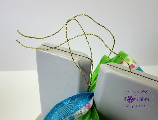 10. Untuck the Bow Wire from under the tool and pull up. One end has a loop, and one end has two cut ends. Insert the cut ends through the loop end. While holding the ribbon down with one hand, pull the cut ends of the wire up snuggly.