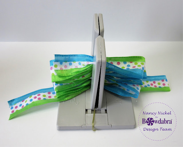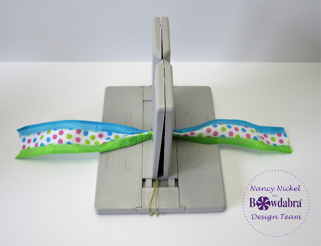 2. Next, measure around the neck of the teddy bear, and cut a ribbon to fit. In this case, it was 12″ in length. That is inserted into the Bowdabra tool, right side facing up, as shown in the photo.