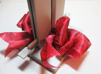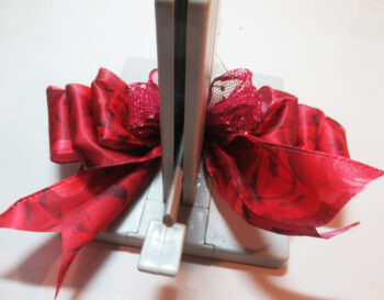 Tuck the ends underneath while making the bow.  Next, place the ribbon in the Bowdabra, leaving a 6″ tail.