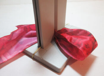 Create a 3 looped bow, folding and twisting the ribbon as it passes through the channel.