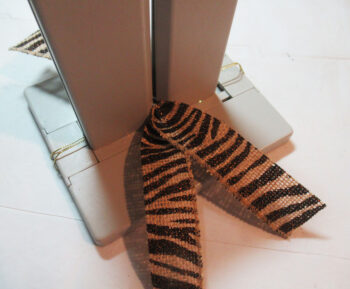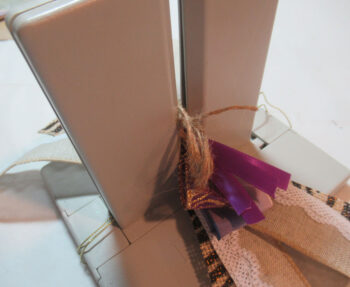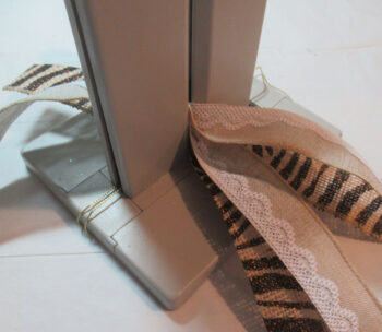 I wanted to use burlap ribbon, but found it too wide so I cut an 8″ length of ribbon, then cut it in half.