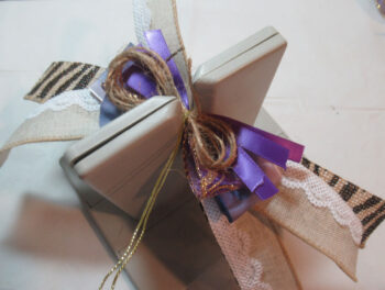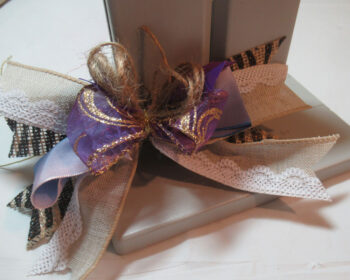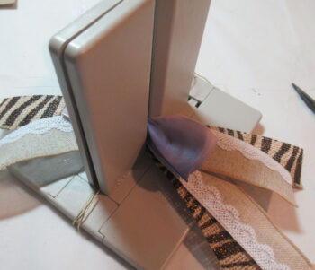 Now cut a 12″ length of lavender ribbon, fold the ends to the center, and place in the Bowdabra (hiding the ends of the ribbon).