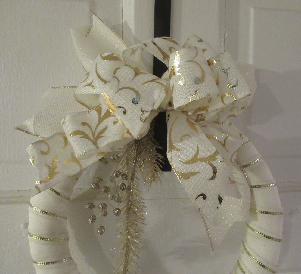 Using a gold floral spray in my stash, I placed it on the wreath, then used the excess bow wire to tie the gold spray and the bow to the wreath.