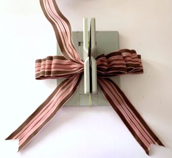 Now, crease the end of the matching ribbon on the roll, and place it in the Bowdabra. Fold a 4″ loop, pinching the center of the ribbon down into the Bowdabra. Fold and pinch the ribbon to make a matching 4″ loop on the opposite side, down into the Bowdabra.