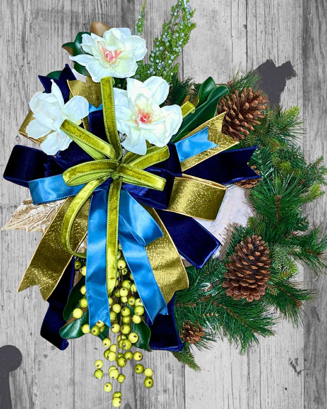 Thread the bow wire through the loop and pull tight. Separate the wire ends, turn to the back and tie a knot and double knot. Use the excess wire to attach the wreath attachment to the wreath. Finally attach the bow to the wreath in the center of the floral attachment. Fluff and arrange everything and you have this stunning and elegant all season wreath!