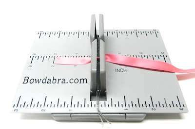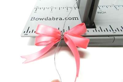 3. Dovetail the end of 3/8″ pink satin ribbon. Make a 2″ tail and press it into the Mini Bowdabra.