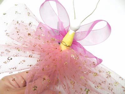 10. Attach the wings to fairies by tying the Bowdabra Bow Wire along the back. Bring the wire back to the front and knot it. Add little knots for hands and trim away excess wire.Add a little face to the fairy using markers.