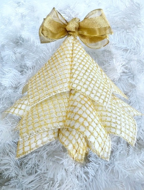 For this ornament, cut out 20 squares. Eight cones for the 1st row, six cones for the second row and six cones for the 3rd row. You can change the number of cones for each row depending on the size of the ribbon tree ornament you want.