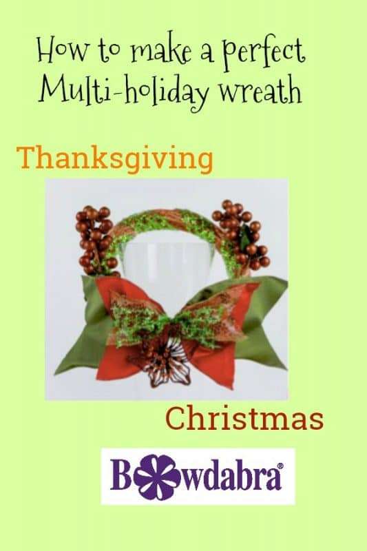 With some holidays it almost seems that as soon as you decorate for the one you are into another one. So Sandy Sandler, the creator of the Bowdabra has come up with a great way to decorate for both holidays in one. You can quickly make this Bowdabra multi-holiday wreath quickly and easily and when Thanksgiving is over it works for Christmas as well.