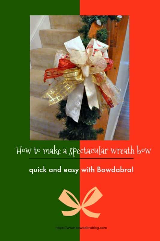 You can quickly make this spectacular large wreath bow in minutes with the helping hands of the Bowdabra bow maker. This gorgeous large wreath bow uses pieces of ribbon and since the largest piece is 40 inches long you can use up what you have on those extra rolls you may have laying around.