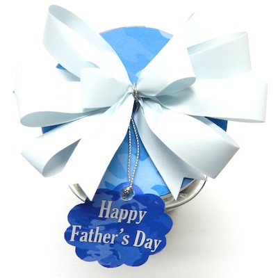 14. Use the wire to attach the Happy Father’s Day tag and glue the bow onto the top of the mason jar cover.