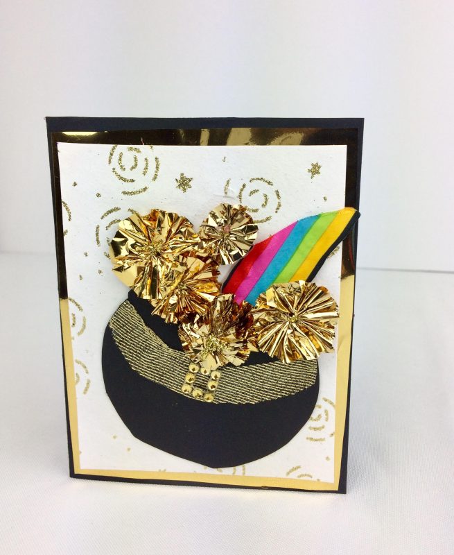 With a piece of gold scrunchy ribbon stuck on a card to form a gold frame and a nice picture sheet encased within, Sandy prepares the base for a beautiful card. She adds a black and gold half moon shaped belt, which looks like a pot, topped with a bit of a gold mesh ribbon and a rainbow colored ribbon. Taking thin strips of gold scrunchy ribbon, she quickly creates 3 tiny gold bows to fill up her pot of gold on the greeting card!