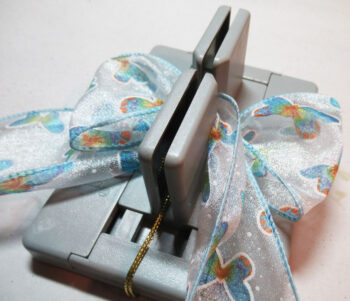 Pull the bow wire through the wire loop and tighten it while the ribbon is still in the Bowdabra.