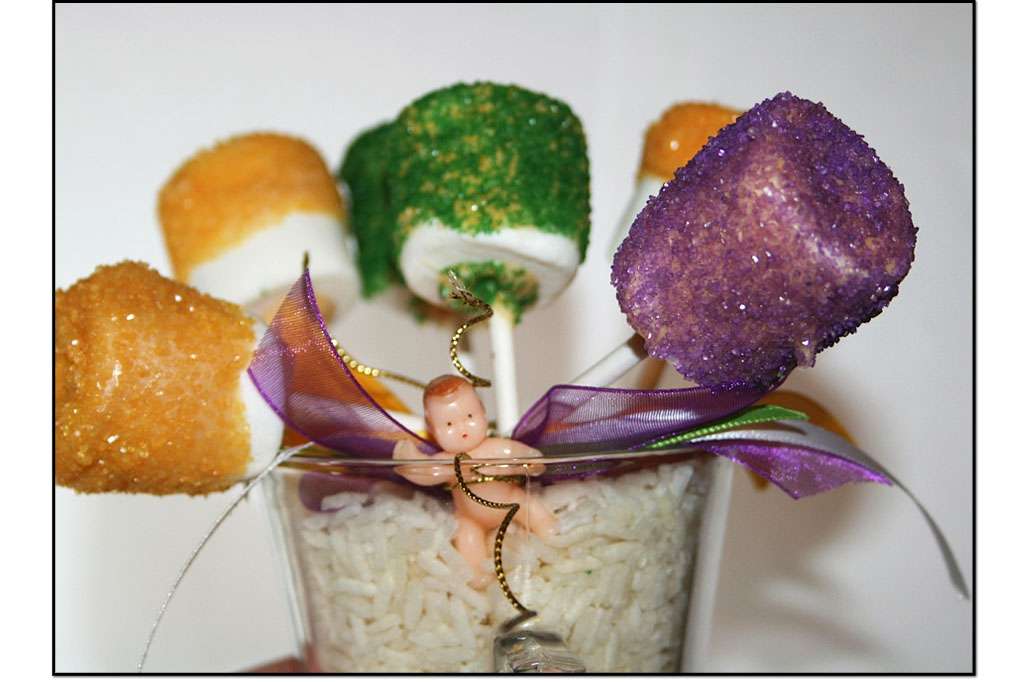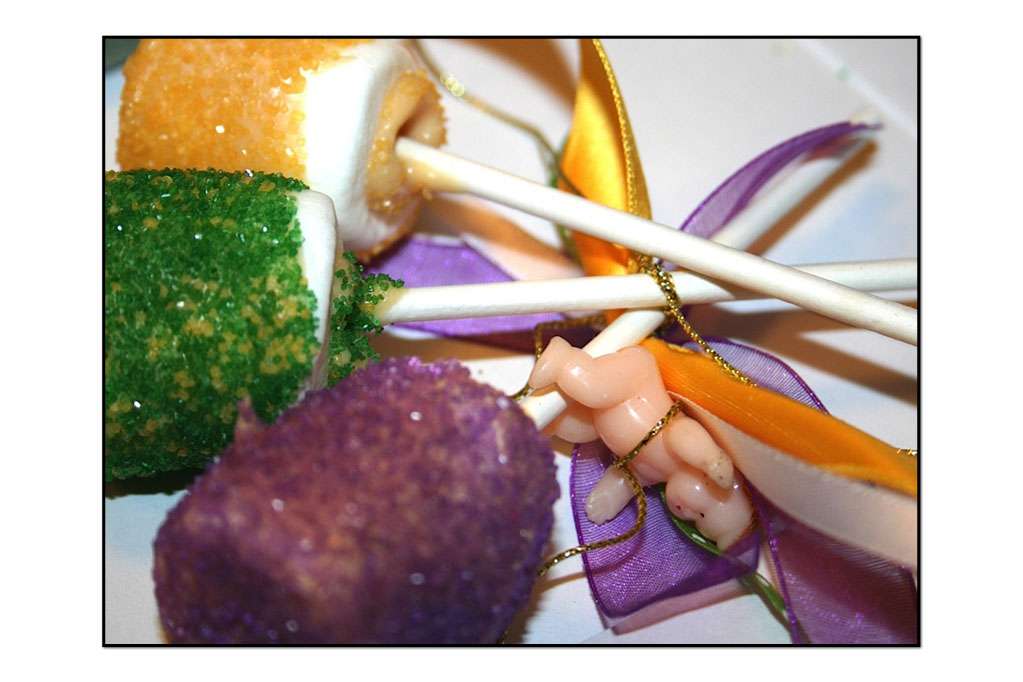 Need help with your Mardi Gras party? Discover an easy to make dessert that is sure to delight your guest’s taste buds! Use the dessert as a table centerpiece, as well. Bowdabra Designer, Susie of SusieQTPies finishes the dessert with a Bowdabra bow and the iconic plastic baby that is often placed inside of king cake.
