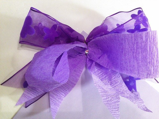 9. Add another layer for the bow using crepe paper. Glue a gem onto the center of bow and dovetail the ends of the ribbon.