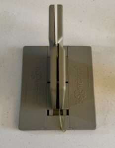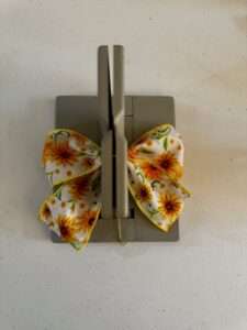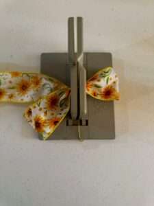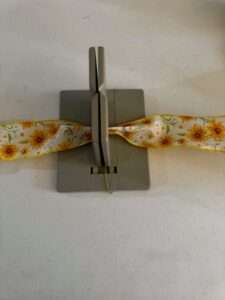 First, cut lengths of 2 ½” wide ribbon 20 inches long.  Next, cut a length of Bowdabra bow wire, fold it in half, and lay it in the Bowdabra.  You will have a loop on one side and two loose wires on the other.  This will be your slipknot.