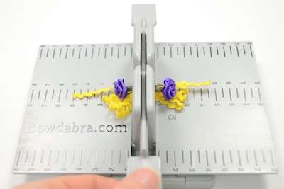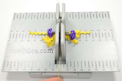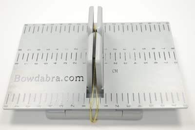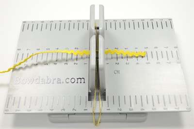 4. To make small bows for the birdhouse place the ruler (metric side) onto the Mini Bowdabra. Cut 18″ of Bowdabra Bow Wire and fold it in half. Place the wire into the Mini Bowdabra.