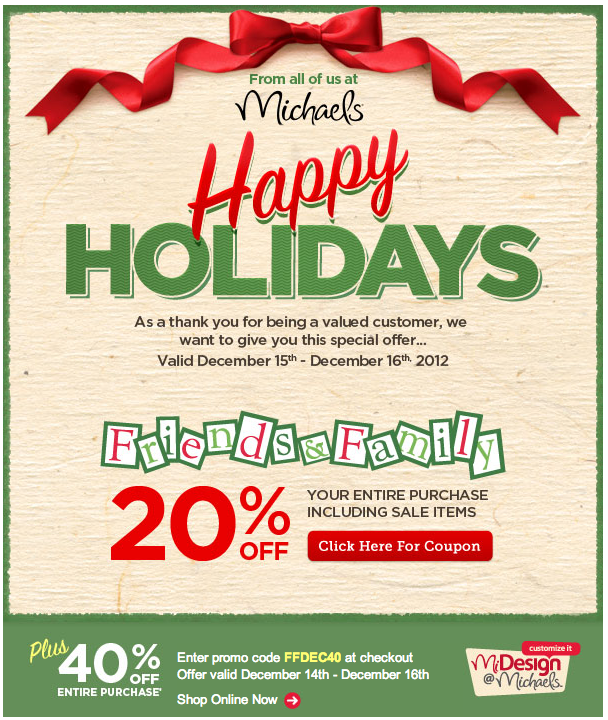 Do you shop at Michaels? We have a special GIFT for you on behalf of Michaels! Go shopping 12/15-12/16 and receive 20% off your entire order, including sale items!
