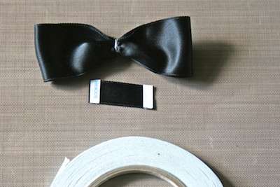 10. Cut 10″ of 1.5″ black satin ribbon. Place scor-tape onto the ribbon.