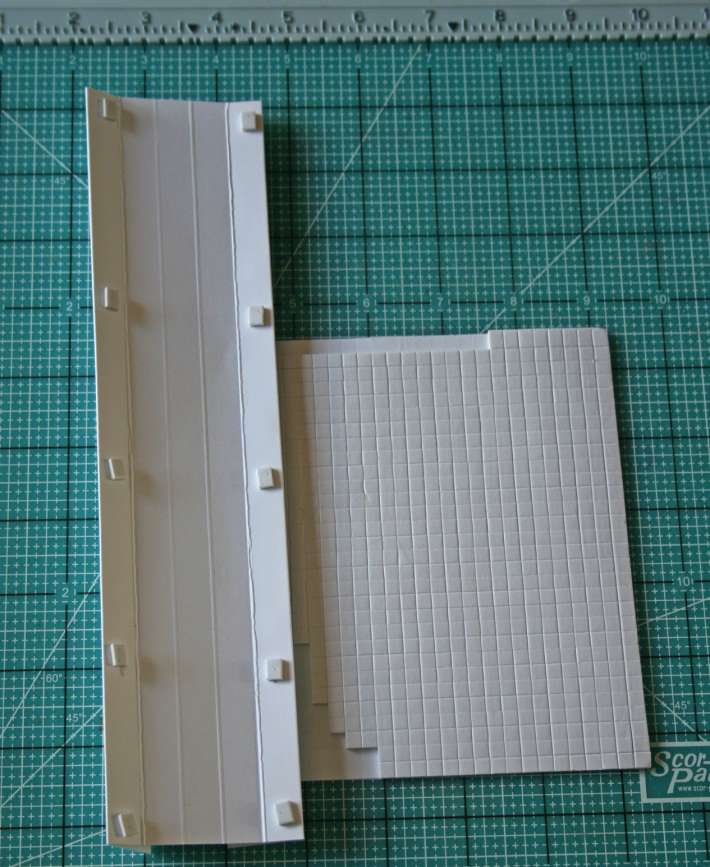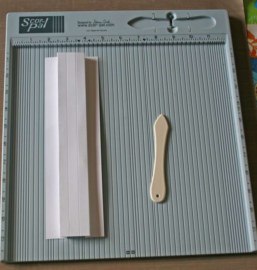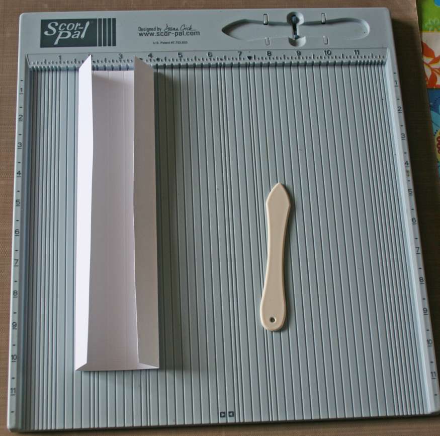 2. Begin with white cardstock cut to the size of: 4.5″w by 10.25″h. Using the Scor-pal score the paper at the 1, 1 ½, 2, 2 ½, 3, 3 ½ inch