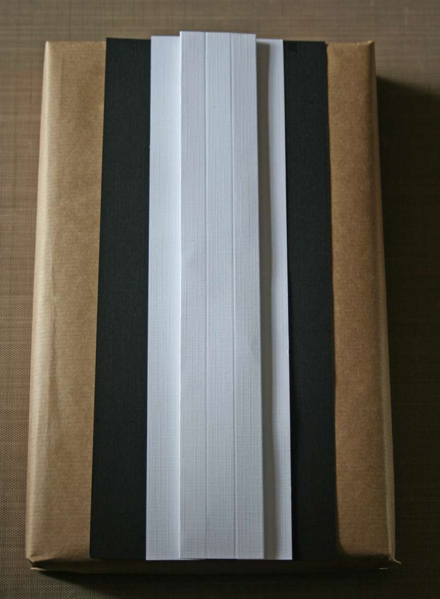 8. Wrap a gift with brown packing paper. Attach a piece of black cardstock (4.5″ by 10.25″) to the front of the gift. Finish with the layered white cardstock that you made using the Scor-pal and 3D foam. Glue it all together.