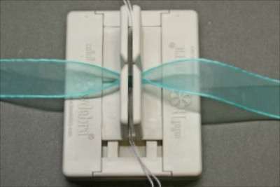 7. To make the bow begin by cutting a piece of ribbon approximately 12″ long. Fold the ribbon in half to create a crease at the crease mark press the ribbon into the Mini Bowdabra.