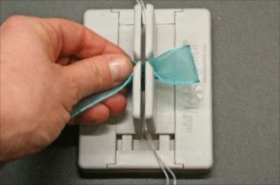 8. Press one side of the ribbon into the Mini Bowdabra to form your first loop.