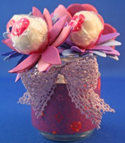 Looking for a exciting craft for Grandparents Day? Using foam sheets design flowers petals with lollipop centers. Finish the craft by decorating a recycled jar with scrapbooking paper and finish with a lace Mini Bowdabra bow.