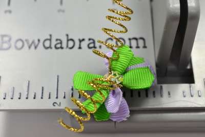 12. Remove the bow from the Mini Bowdabra and bring the wire around the back of the bow. Use a pencil to spiral the remaining bow wire. Add tacky glue to the center of the bow and sprinkle glitter in the center.